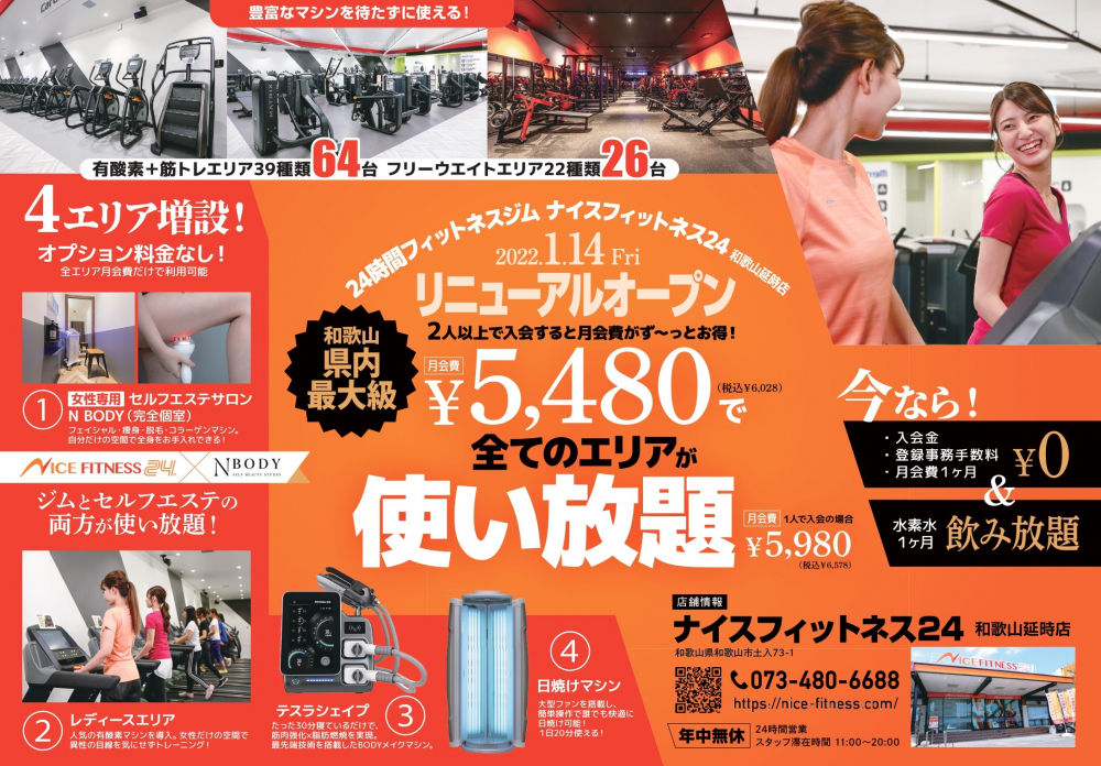 2021.12.28 2022.1.14 延時店がリニューアルオープンします! いつもナイスフィットネス24をご利用頂きありがとうございます。 2022.1.1.14 延時店がリニューアルオープンいたします! ▼リニューアル情報▼ ①女性専用のセルフエステサロンN BODY ②レディースエリア(有酸素マシン) ③テスラシェイプ(筋肉強化×脂肪燃焼マシン) ④日焼けマシン 4エリアが増え、追加のオプション料金もなし! 月会費6,028円~24時間365日使い放題!! さあ、ナイスフィットネスで健康と美を手に入れよう♪